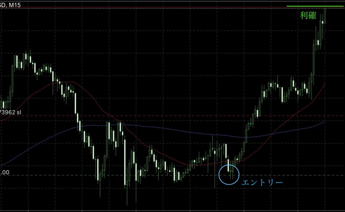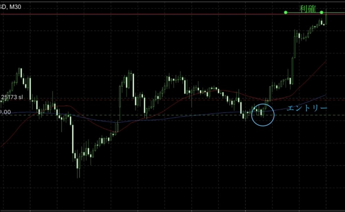 こちらも修正抜けからのロングエントリーです。利確は分かれ道(50%)での利確なので完璧だったと思います。