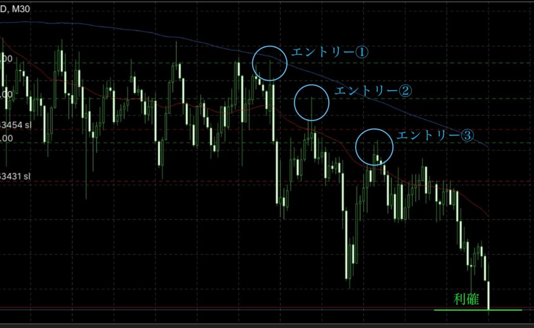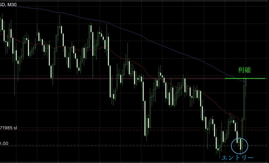 最後にこの場面でのロングエントリーと、そこまでのショートエントリーのエントリーチャートをご覧下さい。