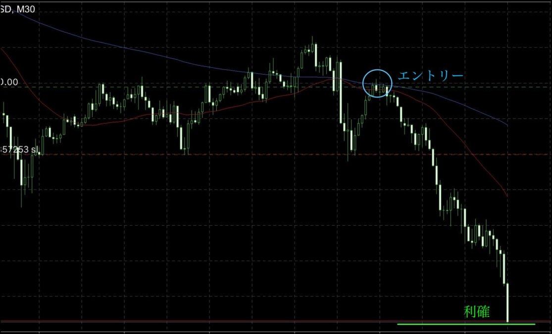 上昇が途切れてからの戻り売り。 てっぺんまでロングしていたので、目標ポイント到達と終わりのサインで利確後に下向きを確認してからの戻り売りです。