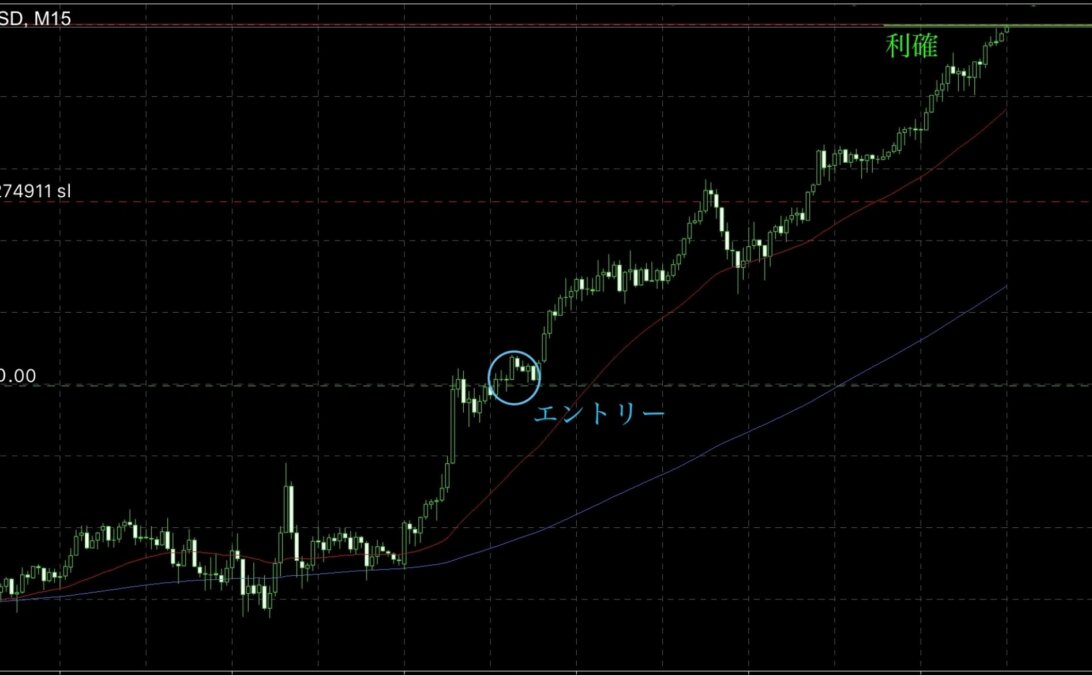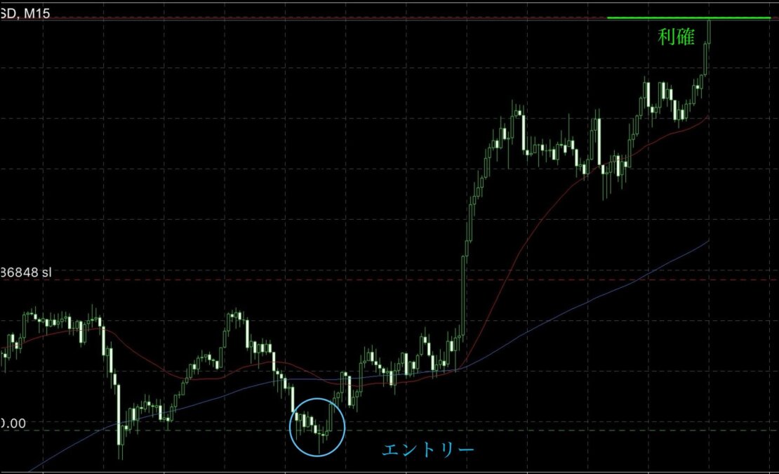 次のトレードは上記の利確ポイントから修正した修正終わりからの再度ロングエントリーになります。